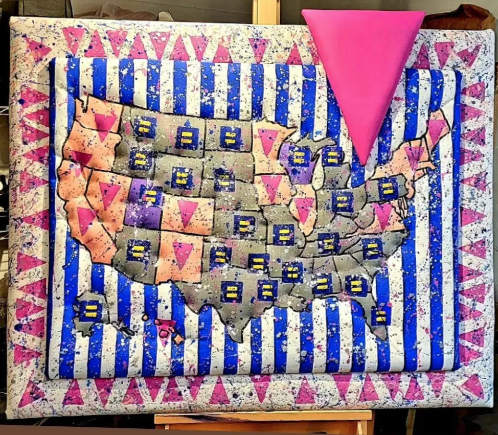 Raymond Vagg's large-scale work speaks directly to gay life in America — its hard-won progress and ongoing struggle. His use of the pink triangle, reclaimed from its history as a Nazi concentration camp symbol, reflects both oppression and empowerment. His work is a snapshot in time: a celebration of how far we have come and a call to continue the pursuit of full equality.